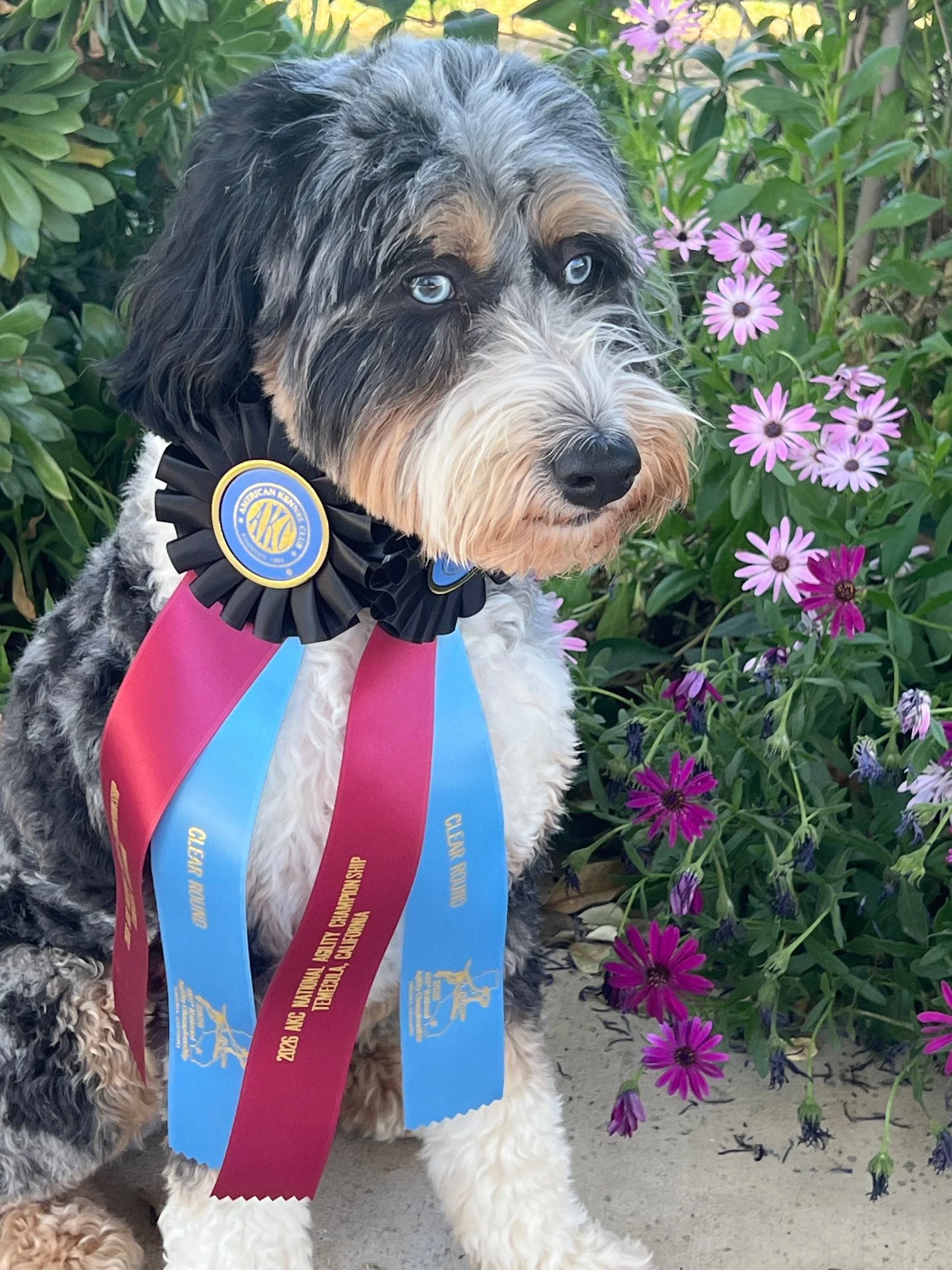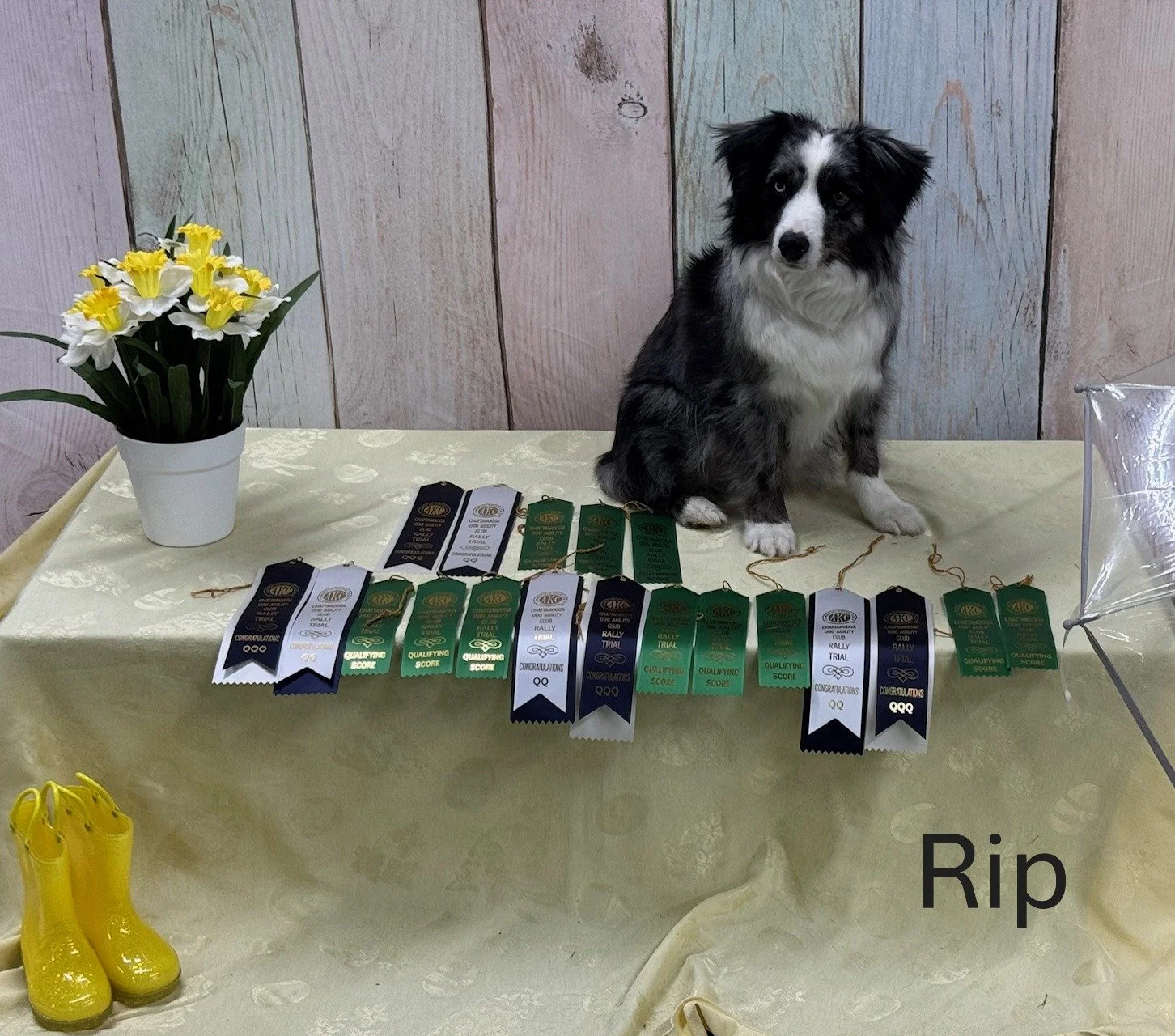 Rip, a Miniature American Shepherd, owned and handled by Dee Rice, earned his Excellent Rally title.