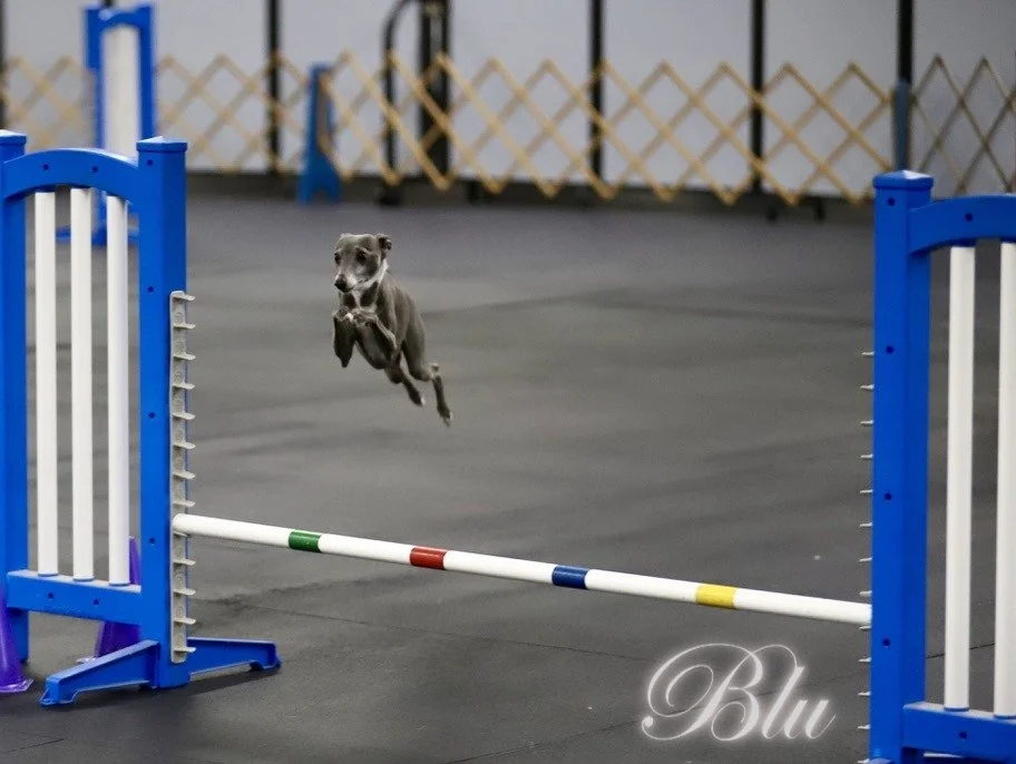 Blu, an Italian Greyhound, owned and handled by Dee Rice, runs a course at the AKC Invitational in Orlando, Florida.